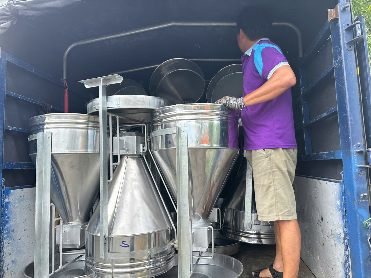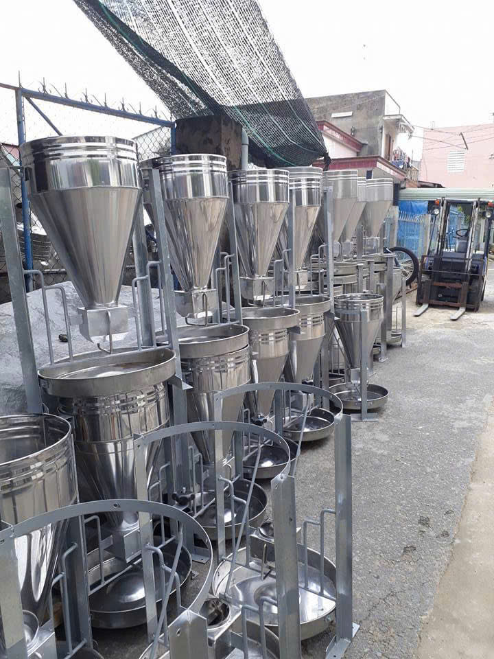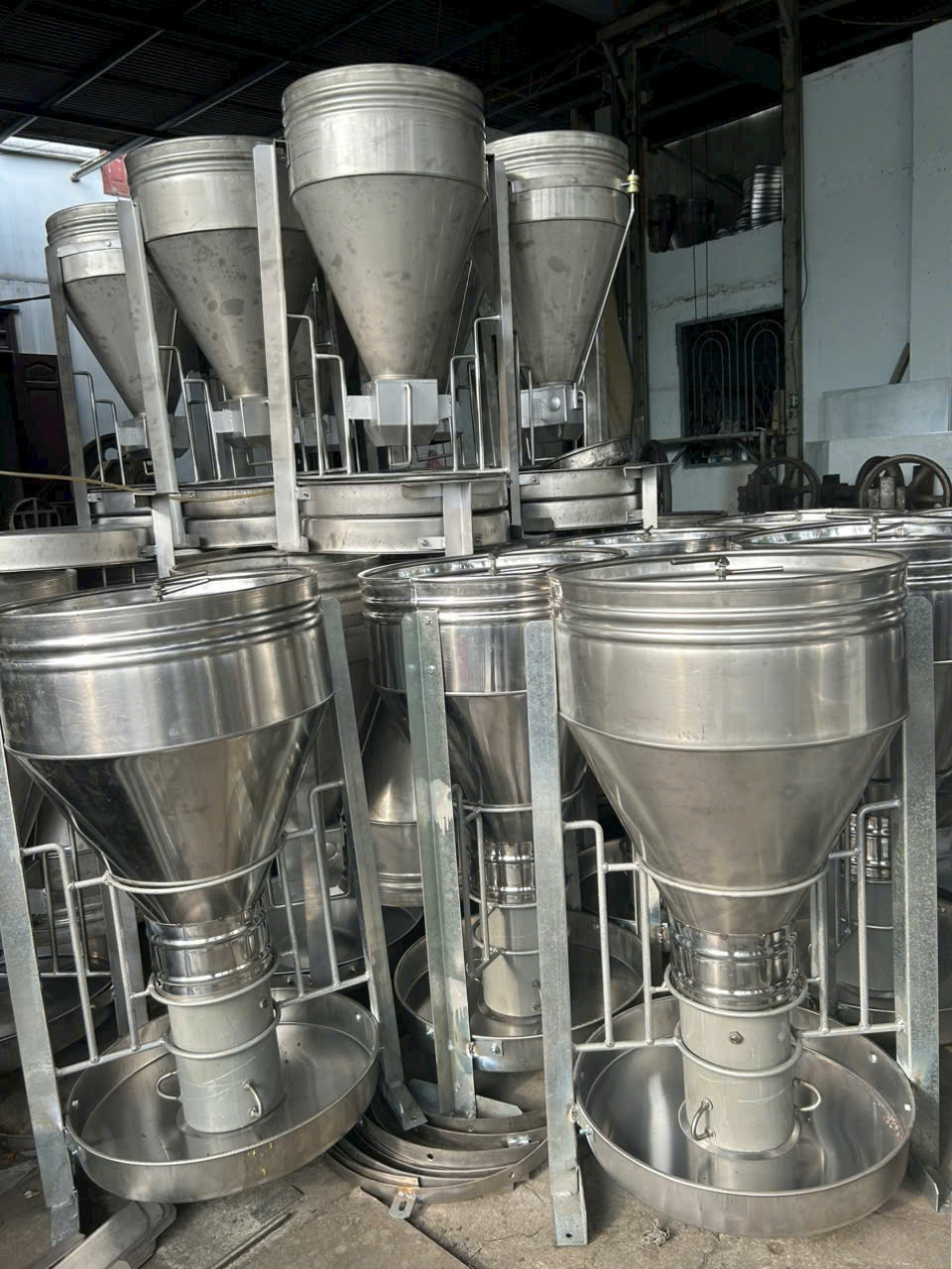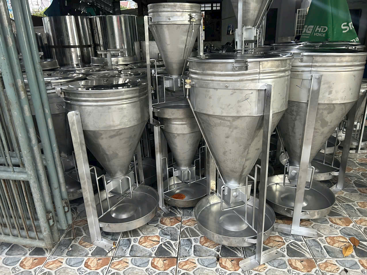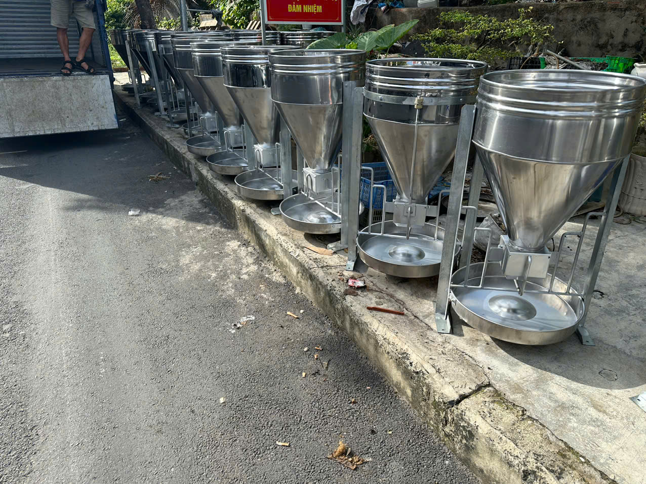 - Máng chứa cám: Được làm từ inox cao cấp, uốn thành hình trụ và hình nón hàn gắn lại với nhau sau đó sử dụng máy ép thành một khối liền duy nhất. Kích thước máng chứa linh hoạt, phụ thuộc vào trọng lượng chứa 30kg, 50kg hoặc 80kg.